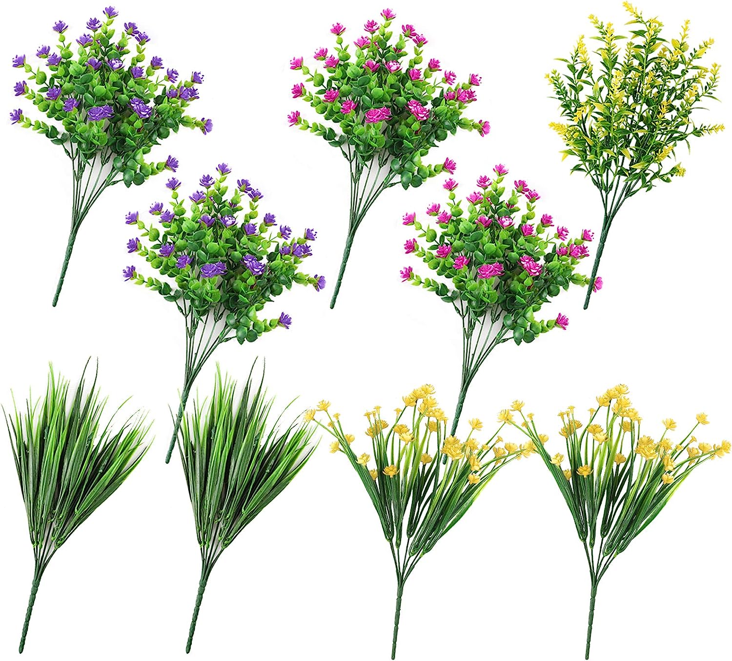 - ❀Artificial flowers outdoor include: 9pcs artificial flowers bulk in total, 2pcs fake red rose flowers, 2pcs plastic wheat grass, 2pcs plastic purple flowers, 2pcs faux yellow daffodils, 1pcs artificial yellow Lavender.